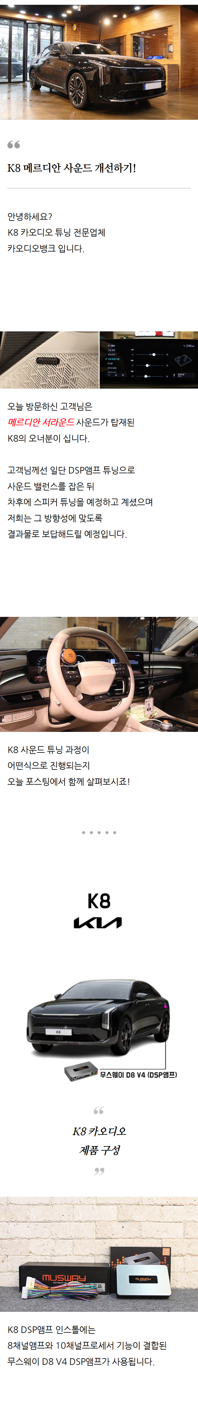 K8 ¼øÁ¤ ¿Àµð¿ÀÀÇ ÇѰè, ¿Àµð½¼ APK-165P ÆÐŰÁö·Î È®½ÇÈ÷ ´Þ¶óÁ³½À´Ï´Ù. 1. ¾÷±×·¹À̵å ÀÌÀ¯ K8À» Ÿ¸é¼­ °¡Àå ¾Æ½¬¿ü´ø ºÎºÐ Áß Çϳª°¡ ¼øÁ¤ ¿Àµð¿À¿´½À´Ï´Ù. óÀ½¿¡´Â ¡°±×³É ¹«³­ÇÏ´Ù¡± Á¤µµ¿´´Âµ¥, º¼·ýÀ» Á¶±Ý¸¸ ¿Ã¸®¸é ±Ý¹æ ¼Ò¸®°¡ °ÅÄ¥¾îÁö°í, º¸ÄÃÀº µµ¾î ¾ÈÂÊ¿¡ ¹¯È÷´Â ´À³¦ÀÌ °­Çß½À´Ï´Ù. ÀúÀ½µµ ¾çÀº ÀÖ´Â °Í °°Àºµ¥ źźÇÔ ¾øÀÌ ÆÛÁö´Â ´À³¦À̶ó À½¾ÇÀ» µè´Ù º¸¸é ÇÇ·ÎÇØÁö´õ±º¿ä. ±×·¡¼­ óÀ½ºÎÅÍ ´ë°ø»ç´Â ºÎ´ã½º·´°í, ÇÁ·ÐÆ® ½ºÇÇÄ¿ + µµ¾î ¹æÀ½ Á¤µµ·Î ±âº»±âºÎÅÍ ÀâÀÚ´Â »ý°¢À¸·Î ¾Ë¾Æº¸´Ù°¡ Ä«¿Àµð¿À¹ðÅ©¿¡¼­ Á¦¾È¹ÞÀº ±¸¼ºÀÌ À̹ø ¼¼Æ®¿´½À´Ï´Ù. 2. ½Ã°ø ÈÄ Ã¹ Àλó ¨ç °¡Àå ¸ÕÀú ´À²¸Áø °Ç º¸Äà À§Ä¡ º¯È­¿´½À´Ï´Ù. ¼øÁ¤¿¡¼­´Â ³ë·¡¸¦ Ʋ¸é ¼Ò¸®°¡ ¾Æ·¡ µµ¾î ÂÊ¿¡¼­ ¿õ¿õ ¿Ã¶ó¿À´Â ´À³¦À̾ú´Ù¸é, Áö±ÝÀº º¸ÄÃÀÌ ¿îÀüÀÚ ÂÊÀ¸·Î ÇÑ ¹ß¦ ´Ù°¡¿Â ´À³¦ÀÔ´Ï´Ù. ƯÈ÷ ¹ß¶óµå³ª ÆË À½¾Ç¿¡¼­ °¡»ç°¡ ¶Ç·ÇÇØÁ³°í, º¼·ýÀ» ¿Ã·Áµµ ¹ßÀ½ÀÌ ¹¶°³ÁöÁö ¾Ê´Â Á¡ÀÌ °¡Àå ¸¸Á·½º·¯¿ü½À´Ï´Ù. ¨è ÀúÀ½Àº ¸¹ÀÌ ´Ü´ÜÇØÁø ´À³¦À̰í ű µå·³À̳ª º£À̽º ¶óÀÎÀÌ Á¤¸®µÅ¼­, À½¾Ç Àüü°¡ ÈξÀ ¾ÈÁ¤ÀûÀ¸·Î µé¸³´Ï´Ù. ¨é °íÀ½ÀÌ ¼±¸íÇѵ¥ ÇǰïÇÏÁö ¾Ê½À´Ï´Ù. °íÀ½ÀÌ ¿Ã¶ó¿À¸é º¸Åë ¡°½ð´Ù¡±´Â ´À³¦ÀÌ »ý±æ ¼ö Àִµ¥, APK-165P´Â °íÀ½ÀÌ ºÐ¸íÇØÁ³À½¿¡µµ ±Í°¡ ¾ÆÇÁÁö ¾ÊÀº ¹æÇâÀ̾ú½À´Ï´Ù. ½É¹ú ¼Ò¸®³ª ¿©¼º º¸Äà °í¿ªÀÌ ±ú²ýÇØÁ³°í, ¿À·¡ ¿îÀüÇϸ鼭 À½¾ÇÀ» µé¾îµµ ÇǷεµ°¡ È®½ÇÈ÷ ÁÙ¾ú½À´Ï´Ù. ¨ê µµ¾î ¹æÀ½°ú ÀÚÀÛ³ª¹« °¡À̵å, ü°¨ Â÷À̰¡ Å®´Ï´Ù. À̹ø ÀÛ¾÷¿¡¼­ °³ÀÎÀûÀ¸·Î °¡Àå ÀßÇÑ ¼±ÅÃÀº ½ºÇÇÄ¿¸¸ ±³Ã¼ÇÏÁö ¾ÊÀº °ÍÀÔ´Ï´Ù. µµ¾î ¹æÀ½ ´öºÐ¿¡ ¹®Â¦¿¡¼­ Àâ¼Ò¸®³ª °øÁøÀÌ ÁÙ¾ú°í ÀÚÀÛ³ª¹« °¡À̵å´Â ½ºÇÇÄ¿°¡ ´Ü´ÜÇÏ°Ô °íÁ¤µÅ¼­ ¼Ò¸®°¡ Èçµé¸®Áö ¾Ê°í ¹Ù·Î ³ª¿À´Â ´À³¦À̾ú½À´Ï´Ù. ¡°°°Àº ½ºÇÇÄ¿¶óµµ ÀåÂø ¹æ½Ä¿¡ µû¶ó ¼Ò¸®°¡ ´Ù¸£´Ù¡±´Â ¸»À» ü°¨Çß½À´Ï´Ù. 3. Ä«¿Àµð¿À¹ð ¼­ºñ½º »ó´ãºÎÅÍ ½Ã°ø±îÁö Àü¹ÝÀûÀ¸·Î Àü¹®ÀûÀ̶ó´Â ÀλóÀÌ °­Çß½À´Ï´Ù. ÀÛ¾÷ ¿ª½Ã ¼øÁ¤ ¸¶°¨À» ÃÖ´ëÇÑ À¯ÁöÇϸ鼭 ±ò²ûÇÏ°Ô ÁøÇàµÇ¾ú°í, ½Ã°ø ÈÄ¿¡´Â ÇöÀç ¼¼ÆÃ »óÅÂ¿Í ¿¡ÀÌ¡, ÃßÈÄ ¾ÚÇÁ Ãß°¡ ½Ã º¯È­±îÁö Çö½ÇÀûÀÎ ±âÁØÀ¸·Î ¾È³»ÇØ ÁÖ¾ú½À´Ï´Ù. ÀüüÀûÀ¸·Î ºÒÇÊ¿äÇÑ ±ÇÀ¯ ¾øÀÌ, ÇÊ¿äÇÑ ÀÛ¾÷¸¸ Á¤È®È÷ ÁøÇàÇÏ´Â Àü¹®Á¡À̶ó´Â ´À³¦À̾ú½À´Ï´Ù. 4. ¾ÕÀ¸·ÎÀÇ °èȹ ½ºÇÇÄ¿¸¸ ±³Ã¼ÇÑ »óÅÂÀε¥µµ ü°¨ Â÷ÀÌ´Â ²Ï Å®´Ï´Ù. ´Ù¸¸ ¸çÄ¥ Ÿº¸´Ï, º¼·ýÀ» ´õ ¿©À¯ ÀÖ°Ô ¾²°í ½Í°í ÀúÀ½ÀÇ Èû°ú ´ÙÀ̳»¹ÍÀ» Á¶±Ý ´õ ²ø¾î³»°í ½ÍÀº ¿å½ÉÀÌ »ý±â´õ±º¿ä. ±×·¡¼­ ÃßÈÄ ¾ÚÇÁ Ãß°¡ ÀåÂøÀº ÃæºÐÈ÷ Àǹ̰¡ ÀÖÀ» °Í °°°í, Áö±Ýó·³ ±âº»±â°¡ ÀâÇô ÀÖ´Â »óŶó¸é ¾ÚÇÁ¸¦ ¹°·ÈÀ» ¶§ ü°¨ »ó½ÂÆøµµ Ŭ °Í °°´Ù´Â »ý°¢ÀÌ µì´Ï´Ù. 5. ÃÑÆò 2023³â½Ä K8 ¼øÁ¤ ¿Àµð¿À¿¡¼­ ¾Æ½¬¿ü´ø ´ä´äÇÔ, º¼·ý ÇѰè, ¼Ò¸®ÀÇ Á¤¸® ¾È µÊÀ» À̹ø Audison APK-165P + µµ¾î¹æÀ½ + ÀÚÀÛ³ª¹« °¡ÀÌµå ±¸¼ºÀ¸·Î È®½ÇÈ÷ °³¼±Çß½À´Ï´Ù. ¼Ò¸®´Â ¶Ç·ÇÇØÁö°í º¼·ýÀ» ¿Ã·Áµµ ¹«³ÊÁöÁö ¾ÊÀ¸¸ç Àå½Ã°£ µé¾îµµ ÇǰïÇÏÁö ¾Ê°í ½Í´Ù¸é ÀÌ ±¸¼ºÀ» °­·ÂÈ÷ Ãßõ µå¸³´Ï´Ù.